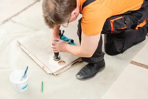 4. ค่อย ๆ ใช้แรงกดลงบนผิวหน้าของกระเบื้อง โดยให้ดอกเจาะผ่านเนื้อกระเบื้องทีละนิด เพื่อยืดอายุการใช้งาน และจะต้องใช้น้ำหล่อเลี้ยงในการเจาะรูกระเบื้องทุกครั้ง