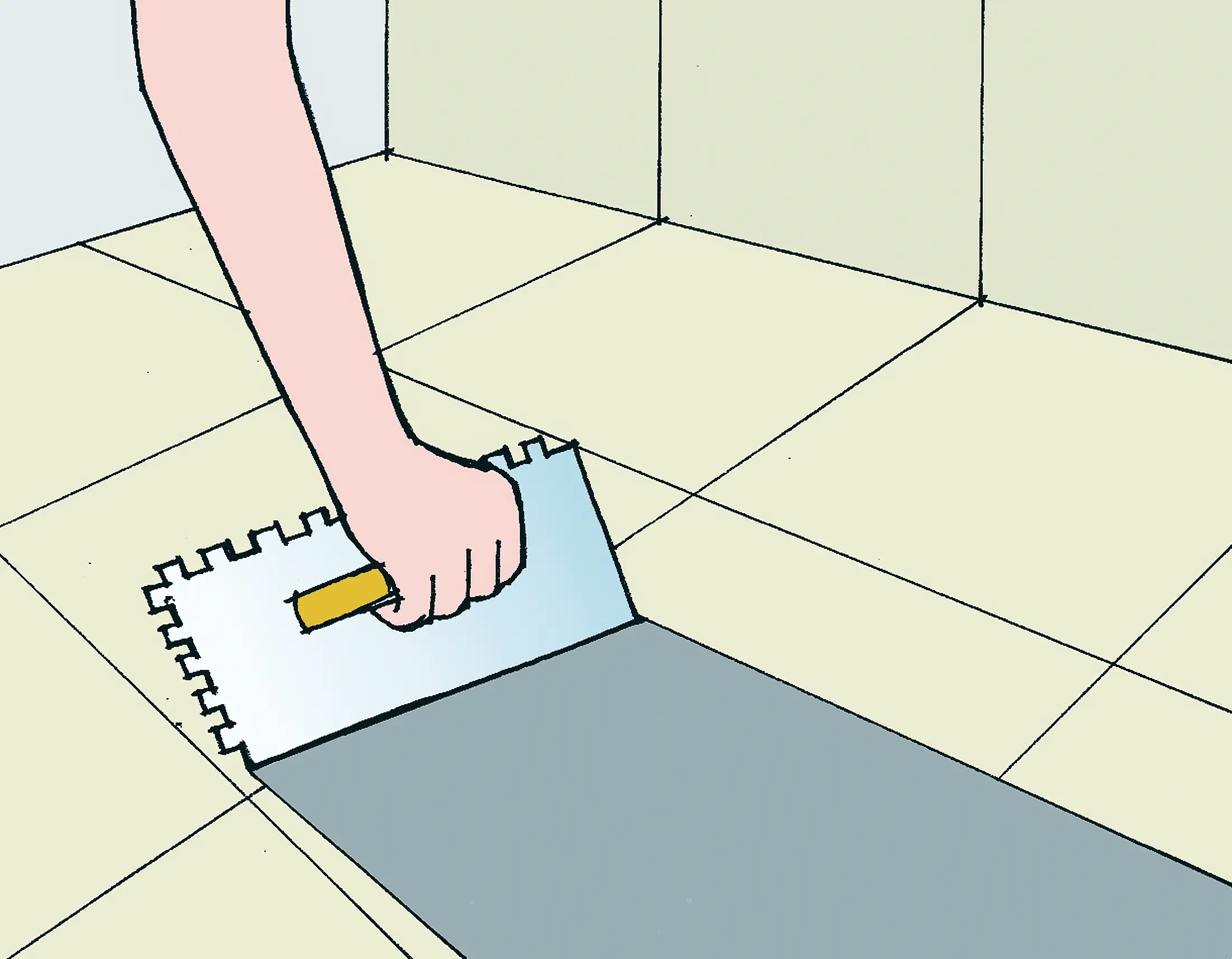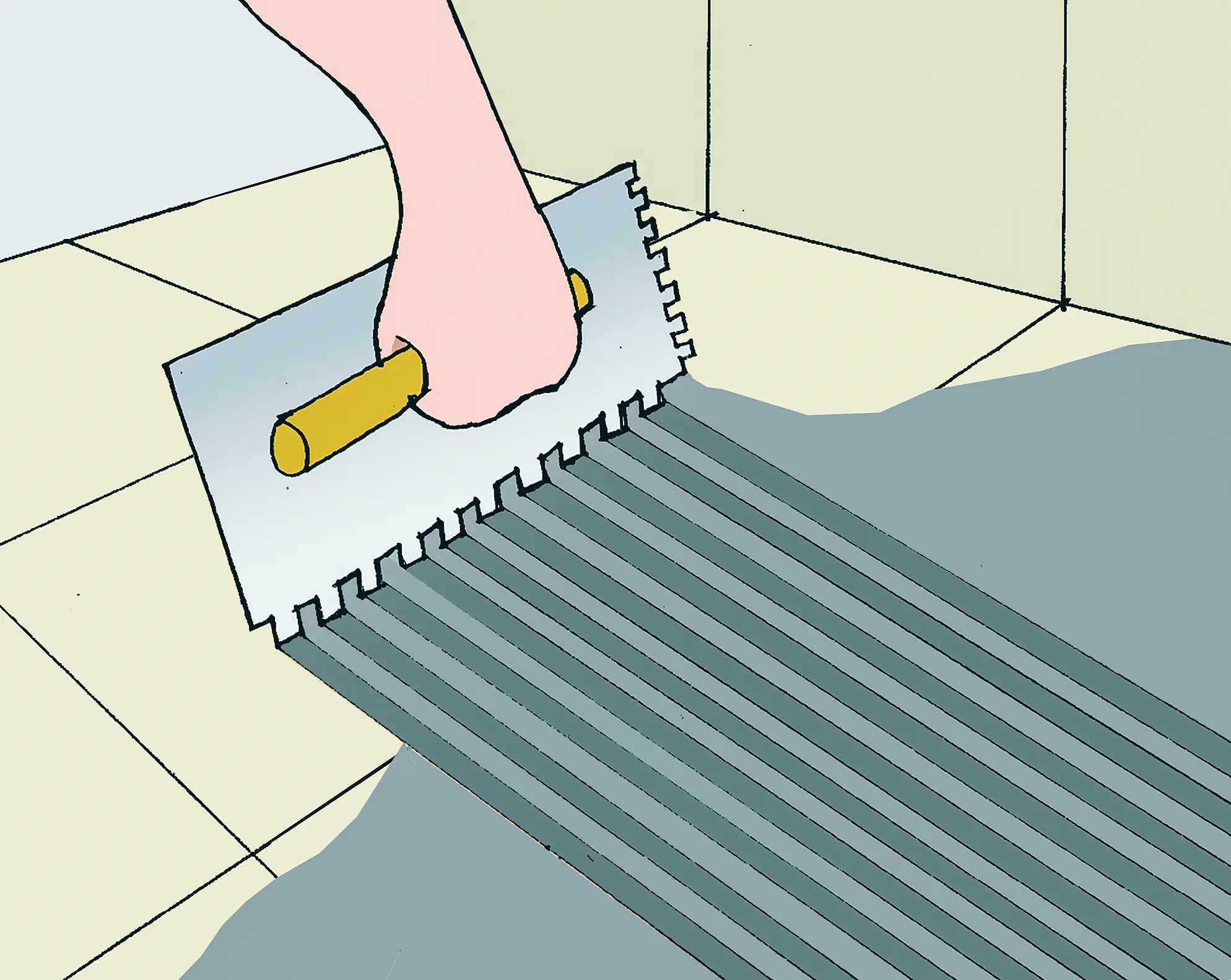 2. ใช้เกรียงหวีด้านเรียบปาดกาวซีเมนต์ลงบนพื้นหรือผนังที่ต้องการปูกระเบื้องให้ทั่วและเพียงพอสําหรับกระเบื้อง ที่จะใช้ปูแต่ละครั้ง ความหนาของกาวซีเมนต์ที่เหมาะสมควรอยู่ระหว่าง 2-10 มิลลิเมตร ขึ้นอยู่กับขนาดของกระเบื้อง