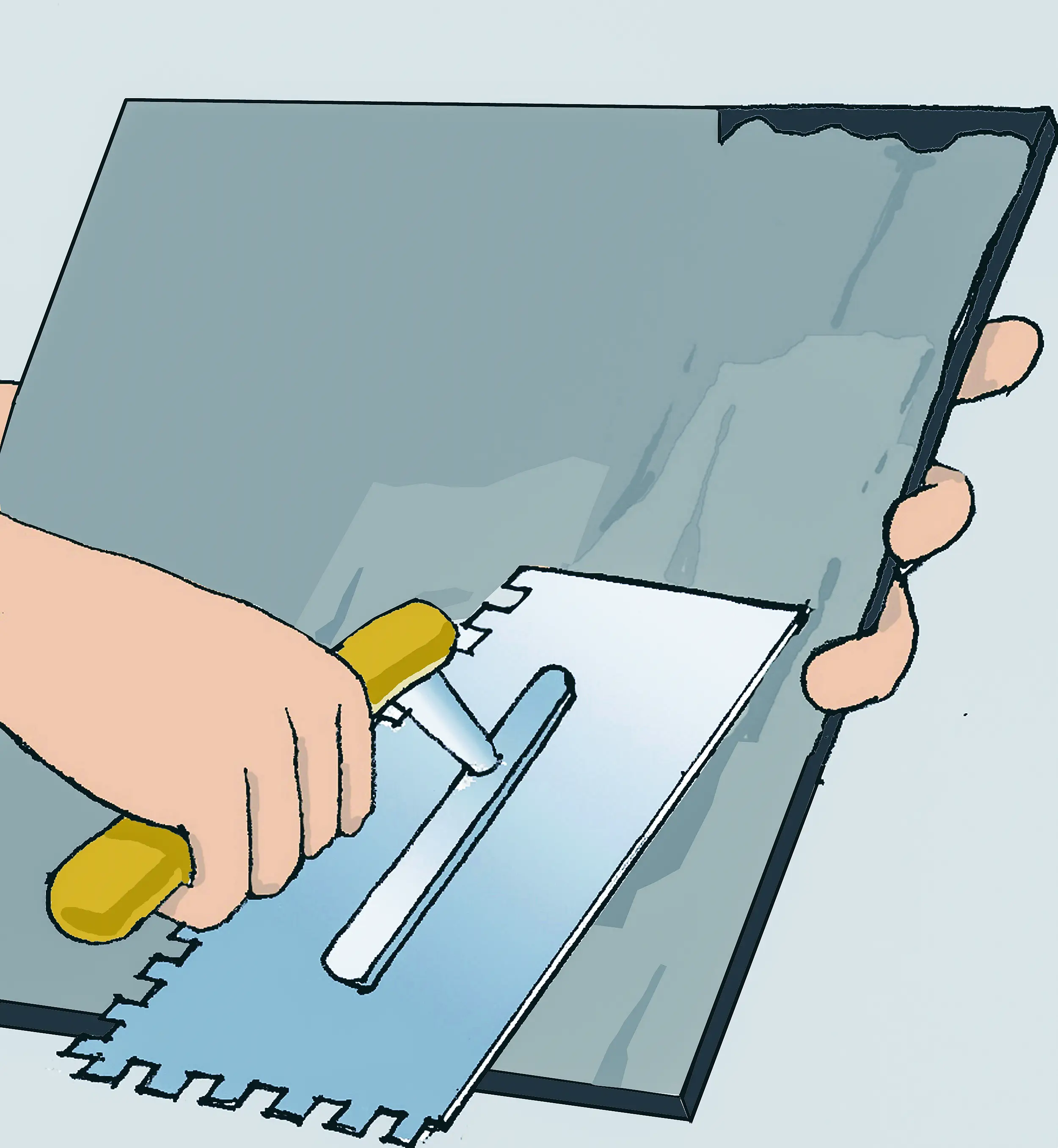 4. ปาดกาวซีเมนต์ไล้หลังกระเบื้องด้วยเกรียงหวีด้านเรียบ เพื่อชดเชยความโก่งหรือบิดตัวของกระเบื้อง และให้มั่นใจว่าปูนกาวอยู่เต็มหลังกระเบื้อง ไม่มีโพรงอากาศ ลดการแตกล่อนในภายหลัง