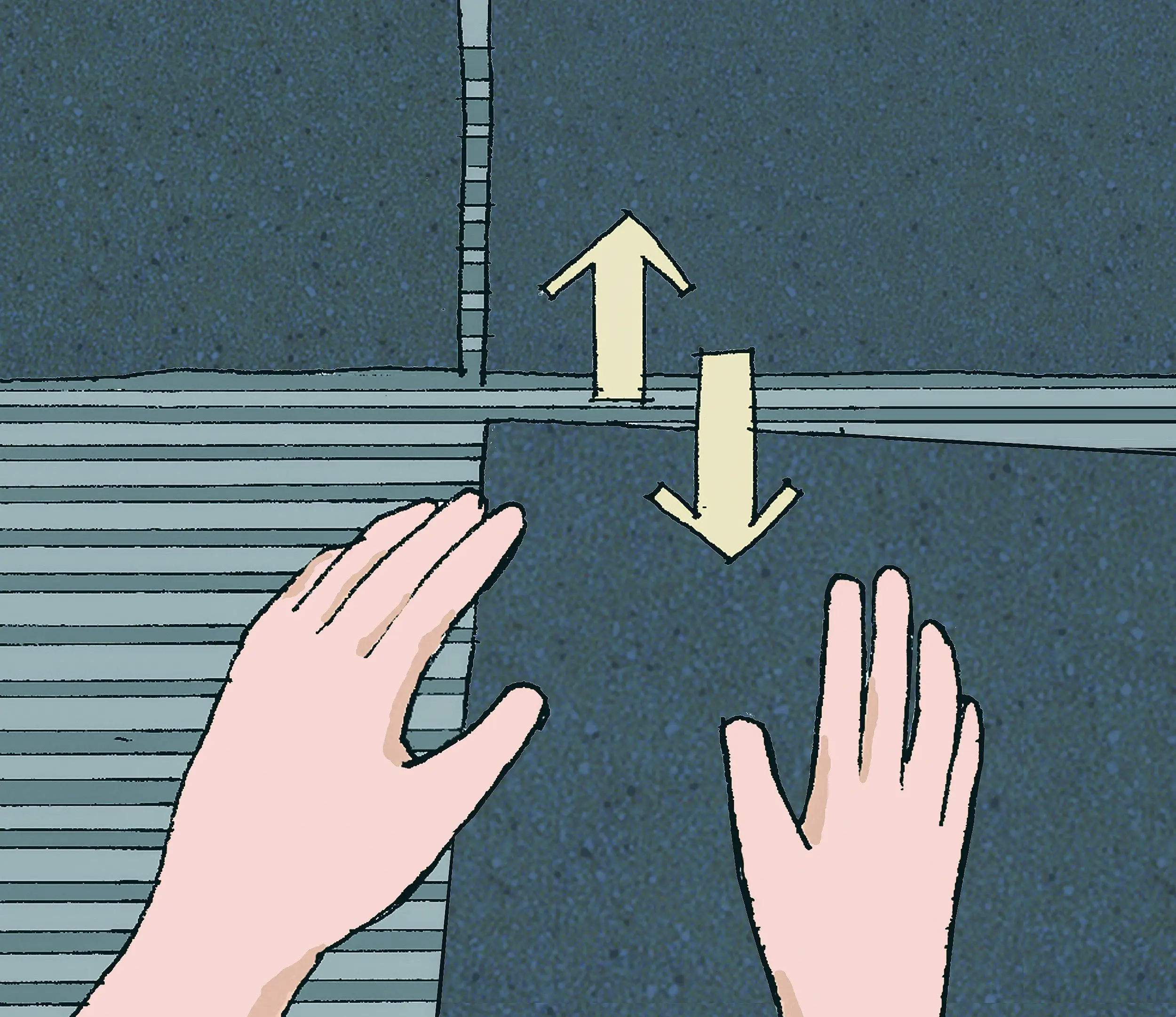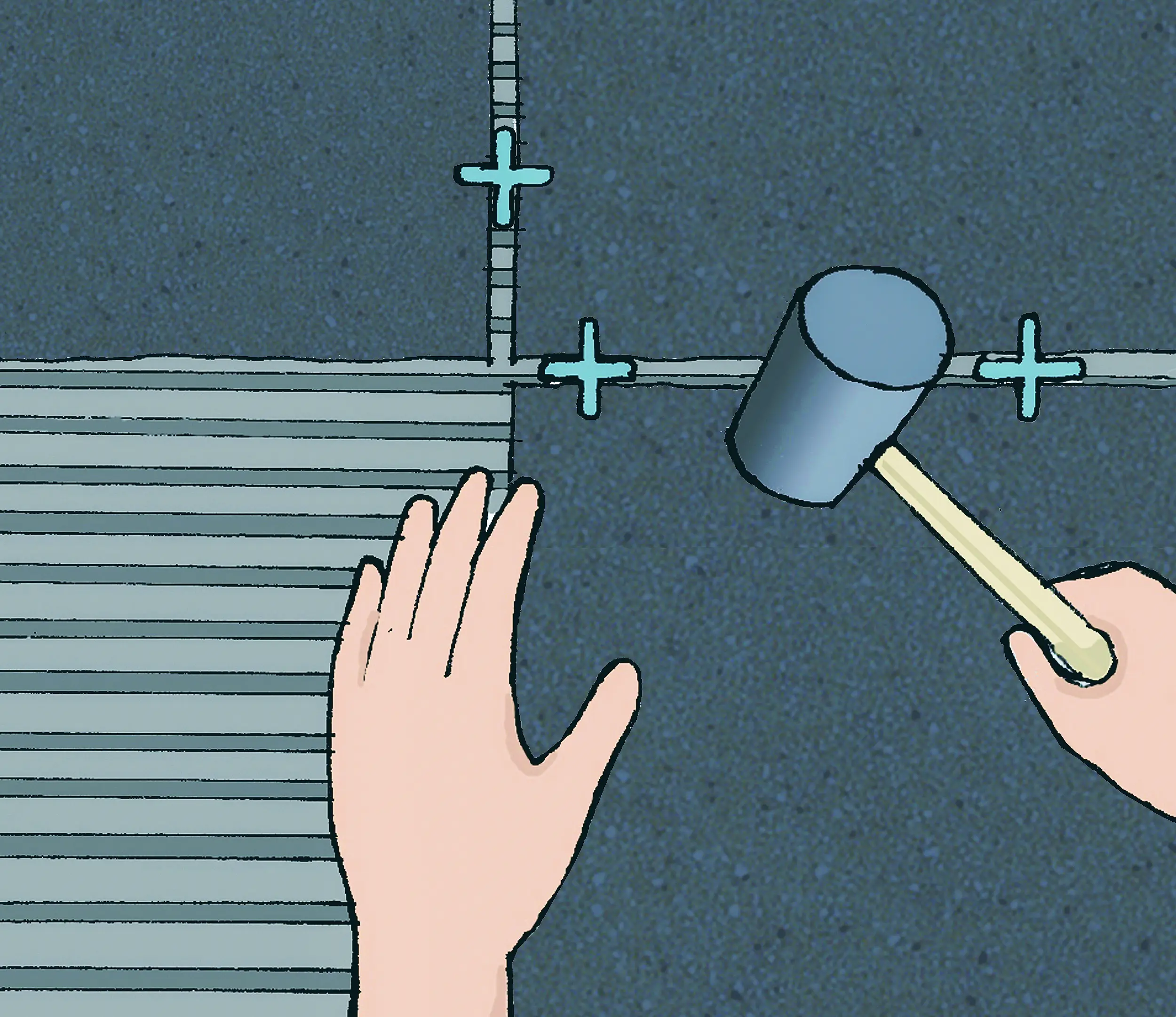 5. ปูกระเบื้องบนกาวซีเมนต์ สไลด์แผ่นกระเบื้องในทิศทางตั้งฉากกับแนวครูด เคาะกระเบื้องให้ติดแน่นทั่วทั้งแผ่น โดยให้หลังกระเบื้องสัมผัสกาวซีเมนต์ เต็มทั่วทั้งแผ่น