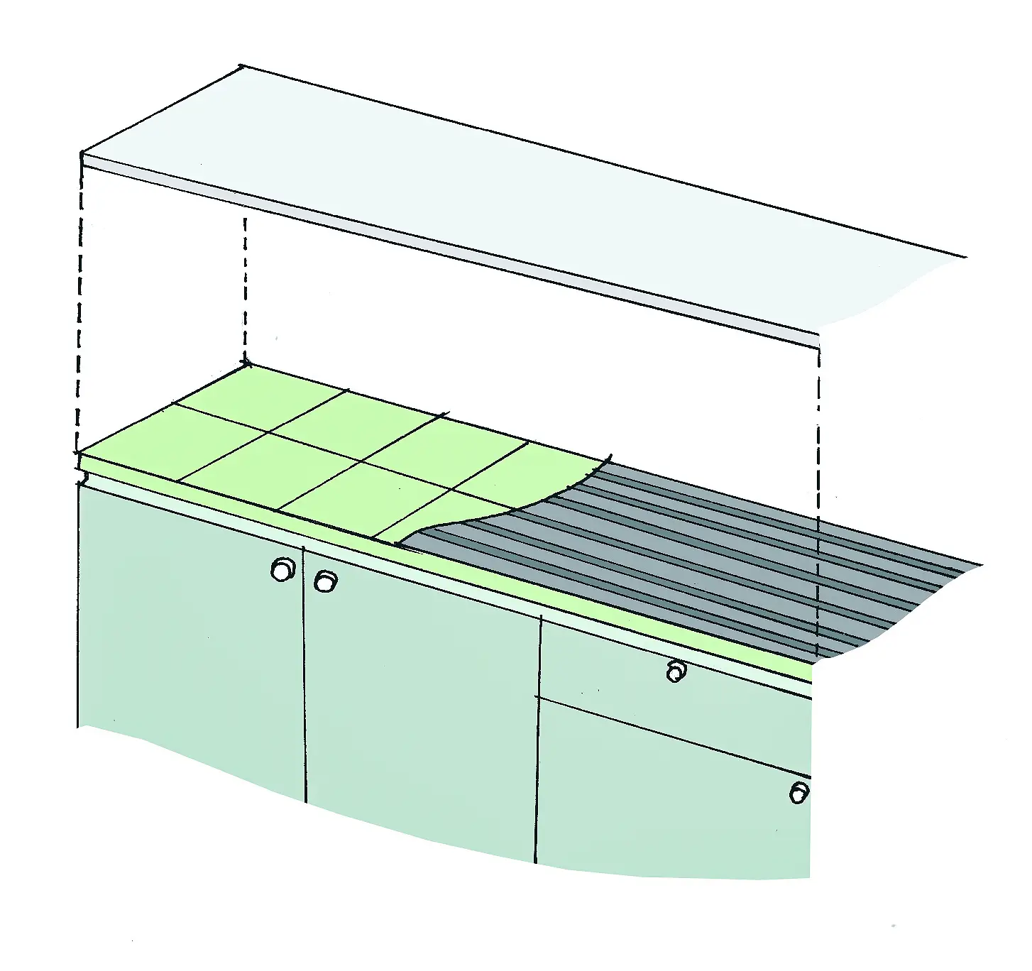 - ตู้แขวนเพดาน การทำตู้หรือชั้นแขวนเพดานต้อง แขวนกับโครงสร้างอาคารเท่านั้น เช่น คานหรือพื้น ชั้นบน ห้ามแขวนกับโครงคร่าวฝ้าเพดานซึ่งไม่สามารถรับน้ำหนักได