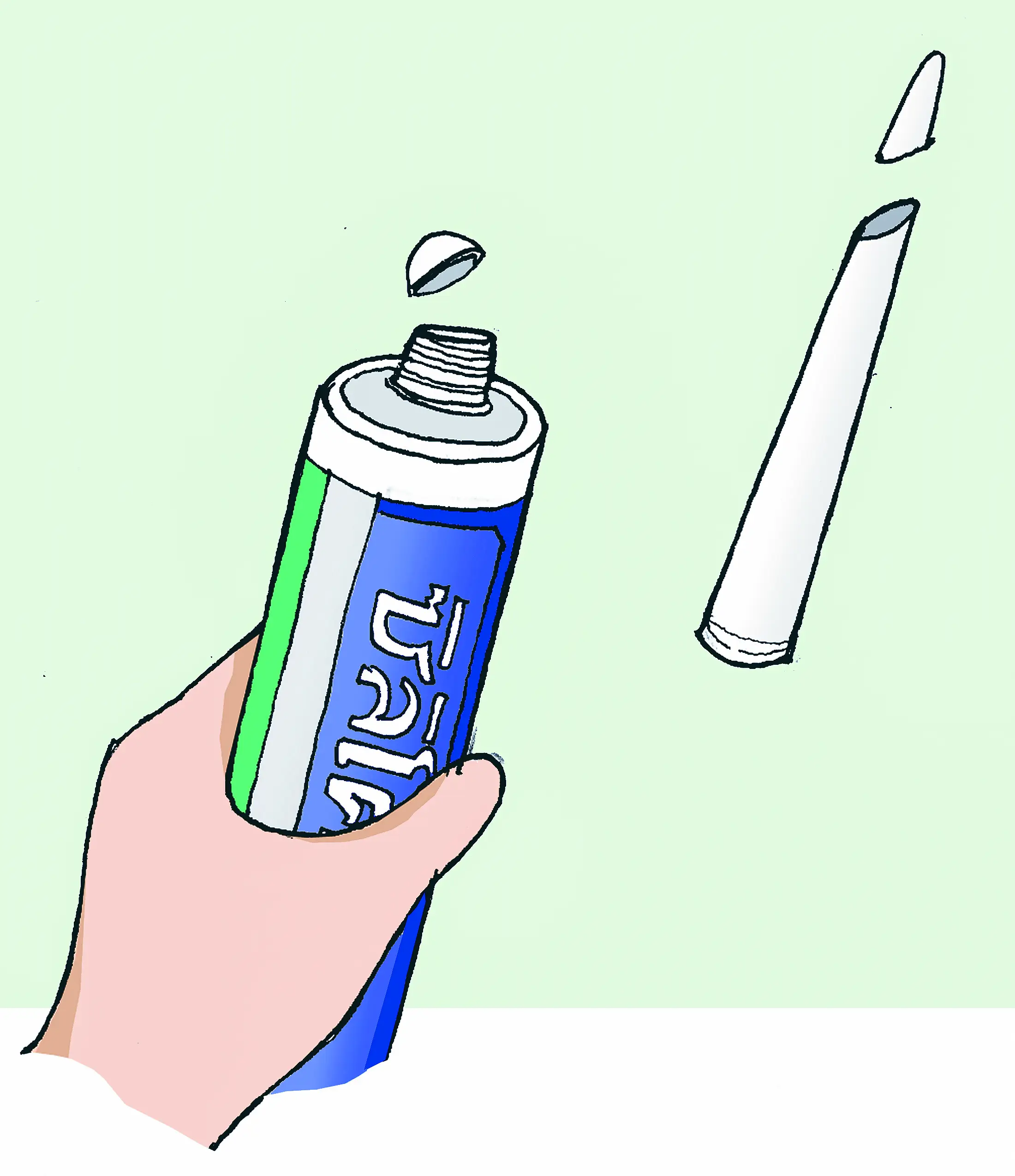 3. ตัดปลายหลอดและปลายจุก (เฉียง 45 องศา) และสวมจุก เข้ากับหลอด ใช้ปืนยิงกาวชนิดก้านคู่หรือแบบอัดลม บีบกาวให้ เต็มร่องยาแนว
