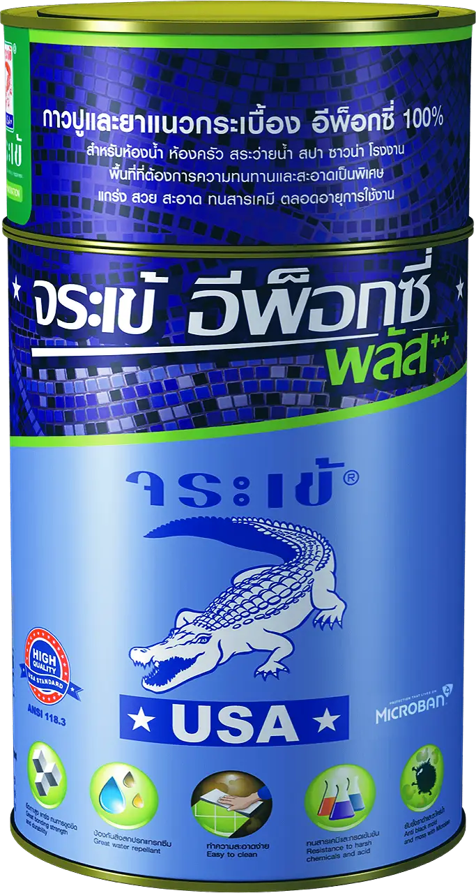 กาวยาแนว & กาวปูกระเบื้อง “จระเข้ อีพ็อกซี่ พลัส” ปลอดภัยสูงสุด ป้องกันราดํา ตะไคร่น้ำและแบคทีเรีย ทนสารเคมี กาวยาแนวมาตรฐานสหรัฐอเมริกาที่สามารถ ปูกระเบื้องยาแนวได้ในตัว จึงเหมาะสําหรับพื้นที่ที่ต้องการความทนทานและพื้นที่ที่ต้องการความสะอาดเป็นพิเศษ เช่น ปูโมเสกแก้ว โมเสกเรซิน หรือวัสดุที่มีปัญหาเรื่องความชื้น (Moisture-sensitive) ใช้ปูได้บนหลากหลายพื้นผิว เช่น ผิวคอนกรีต ผนังอิฐก่อ ผนังปูน ปูทับบนกระเบื้องเดิม แผ่นเหล็ก แผ่นกระจก แผ่นไฟเบอร์กลาส พื้นที่ที่ต้องสัมผัสหรือทําความสะอาดด้วยสารเคมีตลอดเวลา เช่น โรงพยาบาล ห้องเตรียมอาหาร ห้องครัว งานยาแนวภายนอก อาคาร โรงงาน ห้องนํ้า สระว่ายนํ้า ปลอดภัยต่อสุขภาพ