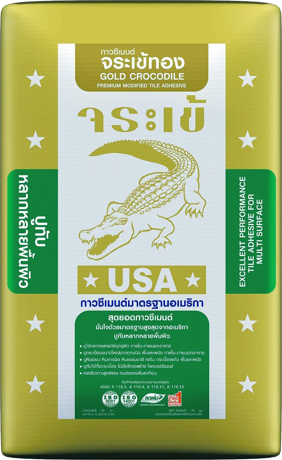 กาวซีเมนต์ปูทับได้หลายพื้นผิว “กาวซีเมนต์จระเข้ทอง” มีผงลาเท็กซ์ที่เพิ่มประสิทธิภาพของกาวซีเมนต์ให้ดีขึ้น มีแรงยึดเกาะสูง มีการยืดหยุ่นที่ดี ทนทานในทุกสภาพภูมิอากาศ ใช้ปูทับกระเบื้องเดิมโดยไม่ต้องสกัดของเก่าทั้งพื้น และผนัง รวมทั้งสามารถใช้ปูบนพื้นผิวไม้อัดโครงสร้าง แผ่นไฟเบอร์ซีเมนต์ ปูได้หลายวัสดุกระเบื้องเซรามิกทุกชนิด หินอ่อน หินแกรนิต หินเทียม โมเสกแก้ว กระเบื้องแก้ว