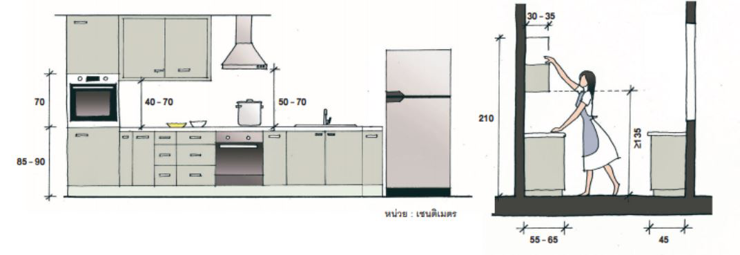 - เคาน์เตอร์ ควรทำสูง 85-90 เซนติเมตร และกว้าง 55-65 เซนติเมตร