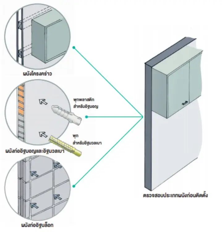 - ตู้ติดผนัง ผนังที่ติดตั้งต้องมีความแข็งแรง จึงควรตรวจสอบประเภทผนังก่อนติดตั้ง