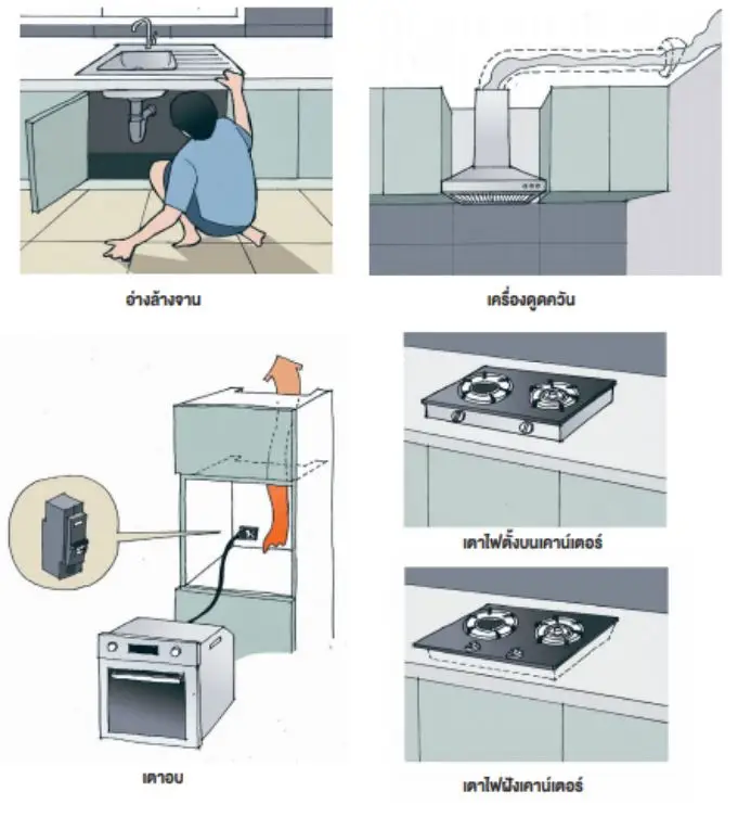 - เครื่องดูดควันและเตาปรุงอาหาร เตาไฟควรสูงเท่ากับท็อปเคาน์เตอร์ ส่วนเครื่องดูดควันควรสูงจากเตาประมาณ 50-70 เซนติเมตร