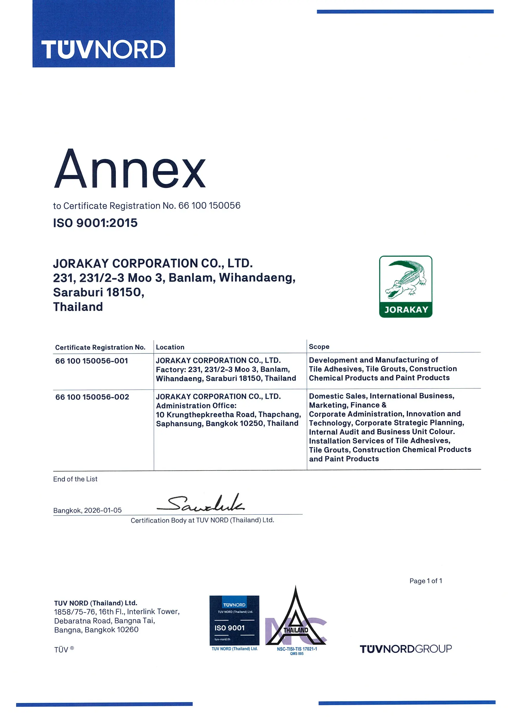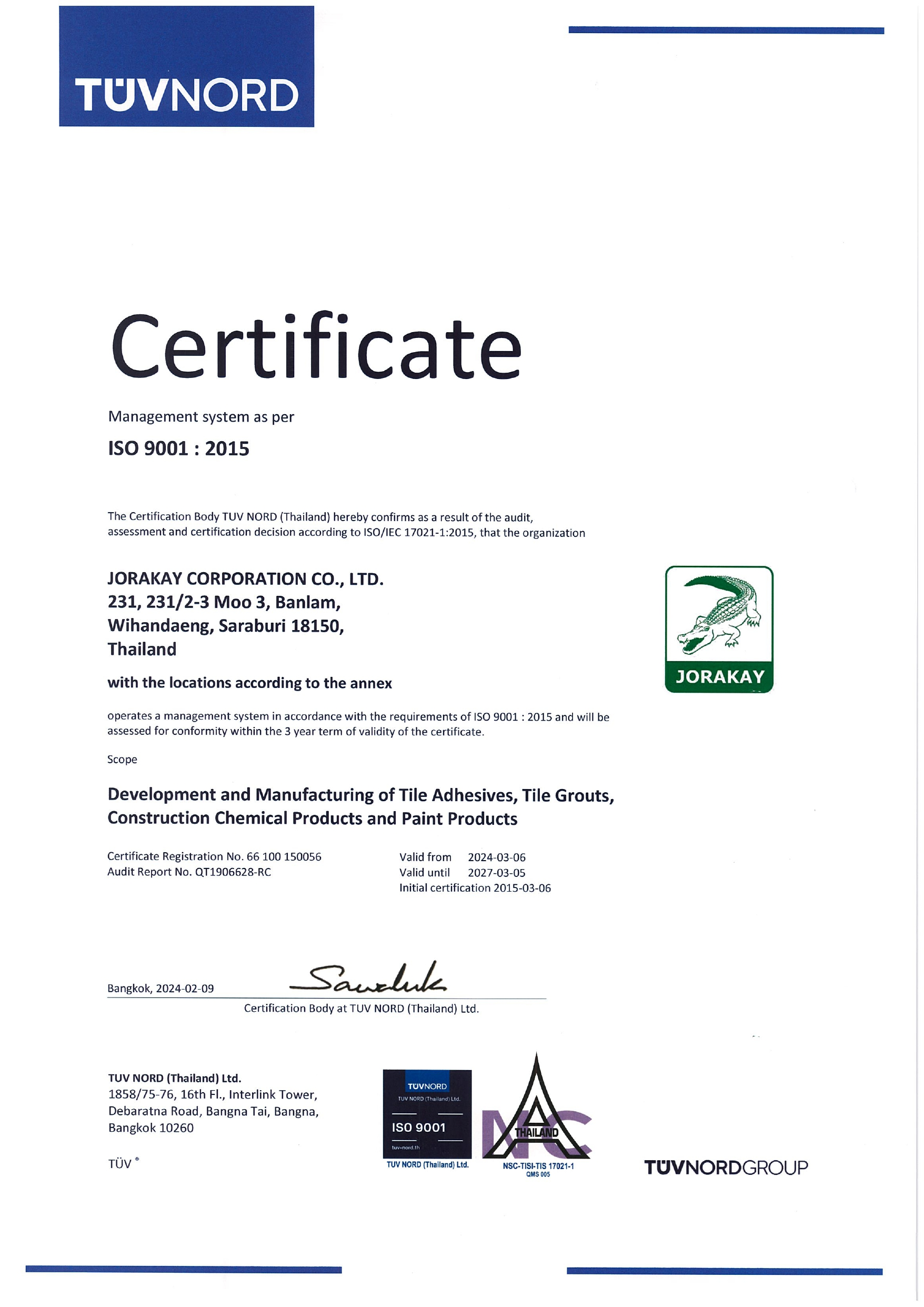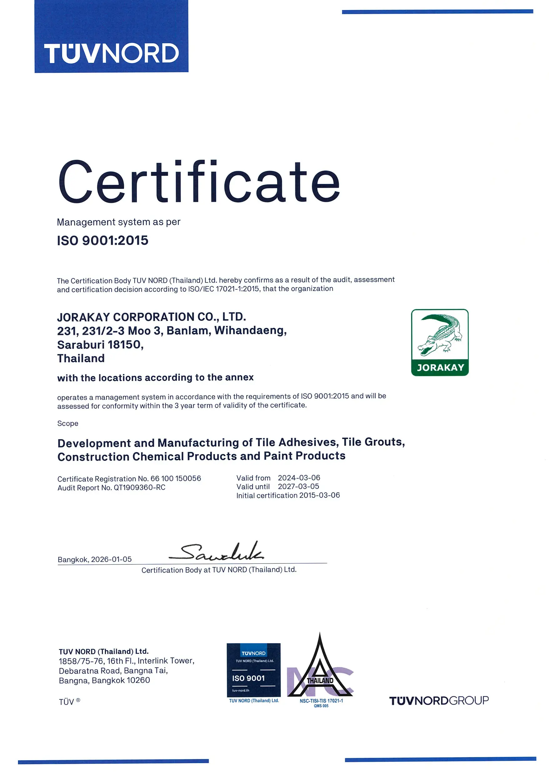 Jorakay Corporation Company Limited is successfully assessed and officially passed for its Quality Management Systems and now certified ISO 9001: 2015 for the headquarter in Marketing, Sale, Human Resource, Administrative, and Purchase Department, and Saraburi Plant in production process of tile adhesive, tile grout, construction chemicals, and paint products.