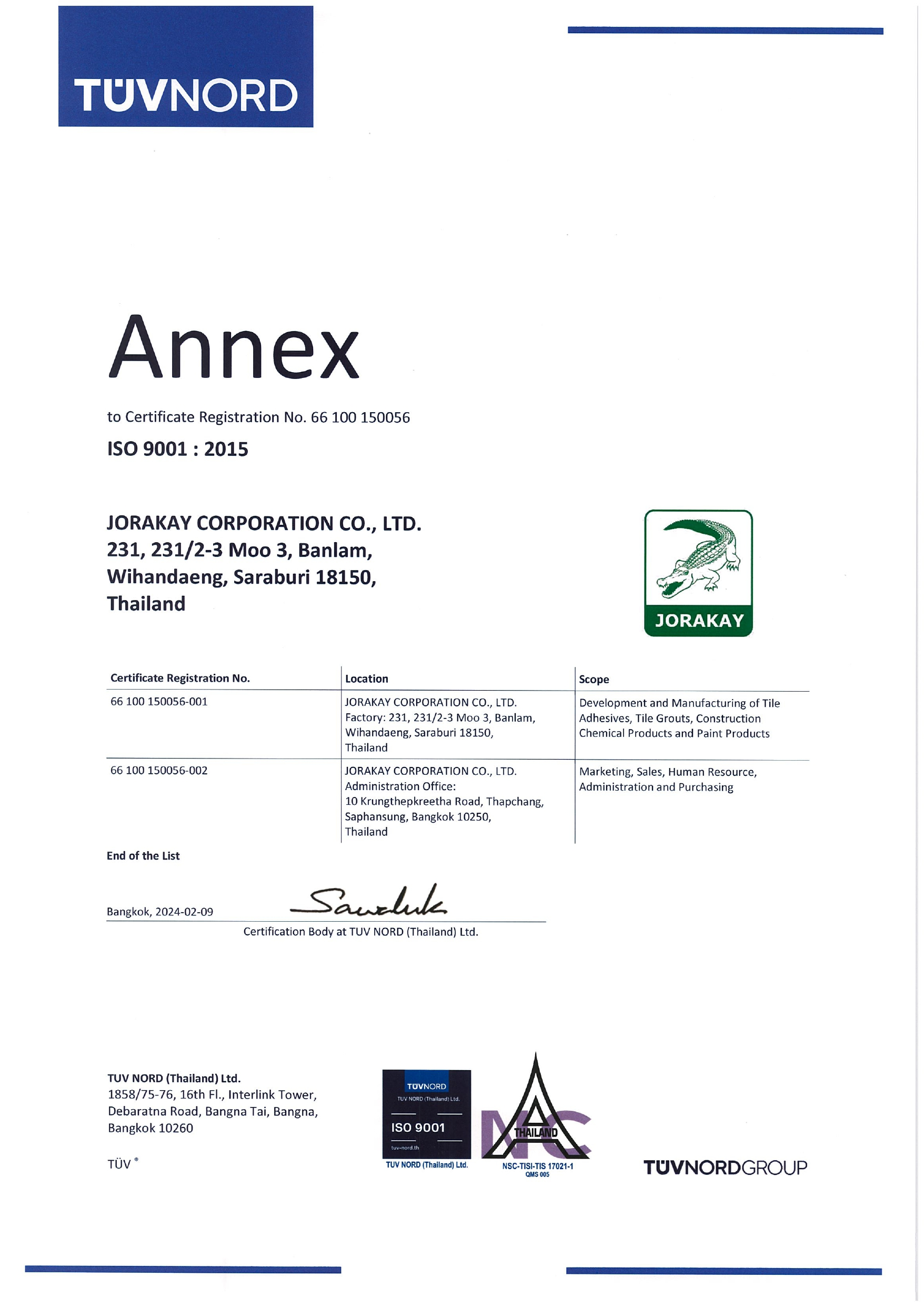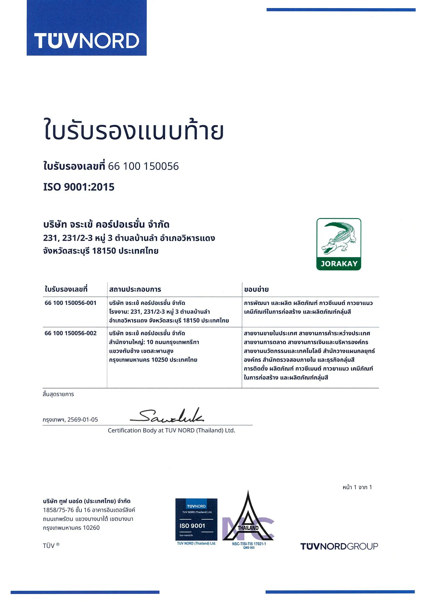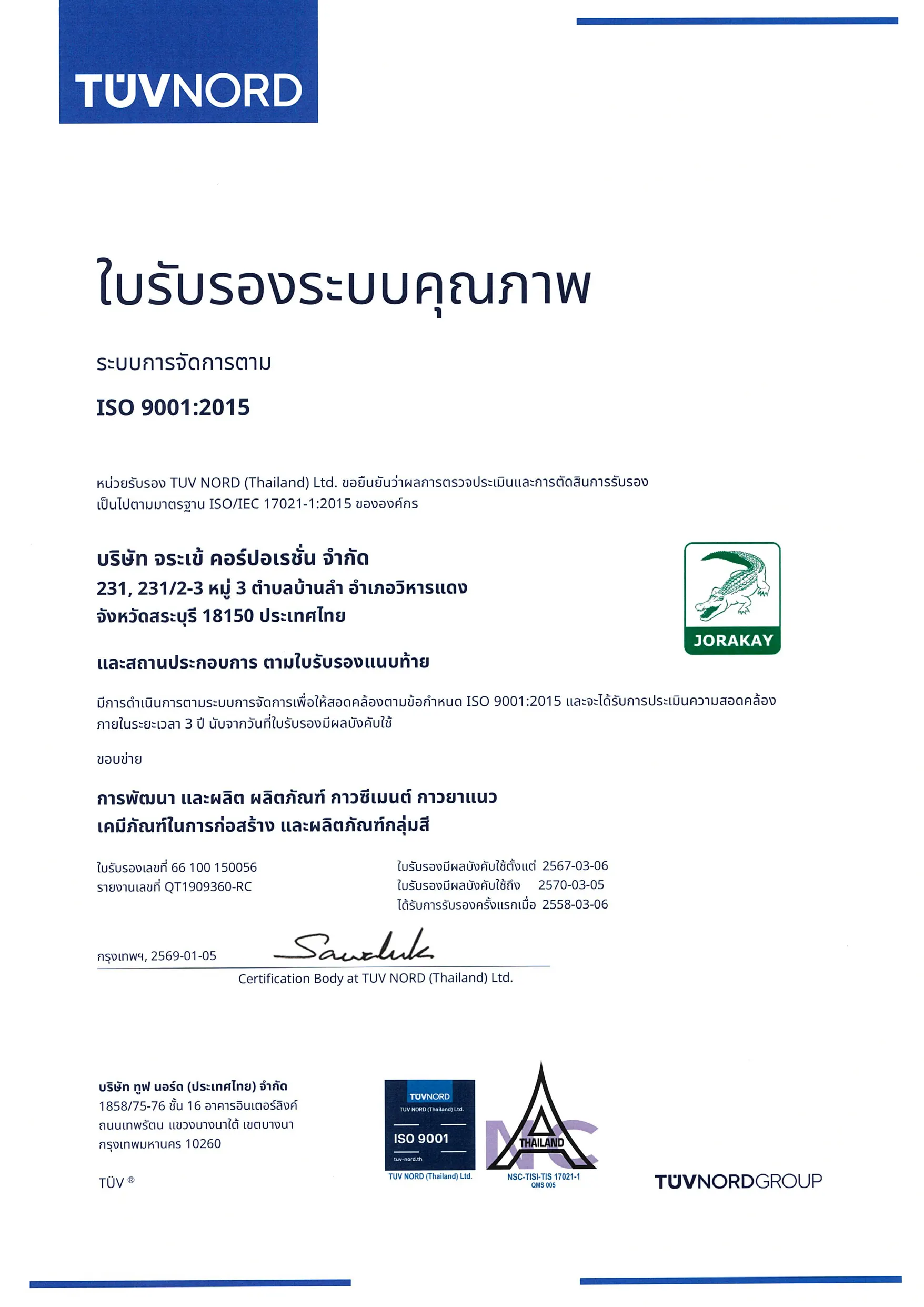 Jorakay Corporation Company Limited is successfully assessed and officially passed for its Quality Management Systems and now certified ISO 9001: 2015 for the headquarter in Marketing, Sale, Human Resource, Administrative, and Purchase Department, and Saraburi Plant in production process of tile adhesive, tile grout, construction chemicals, and paint products.