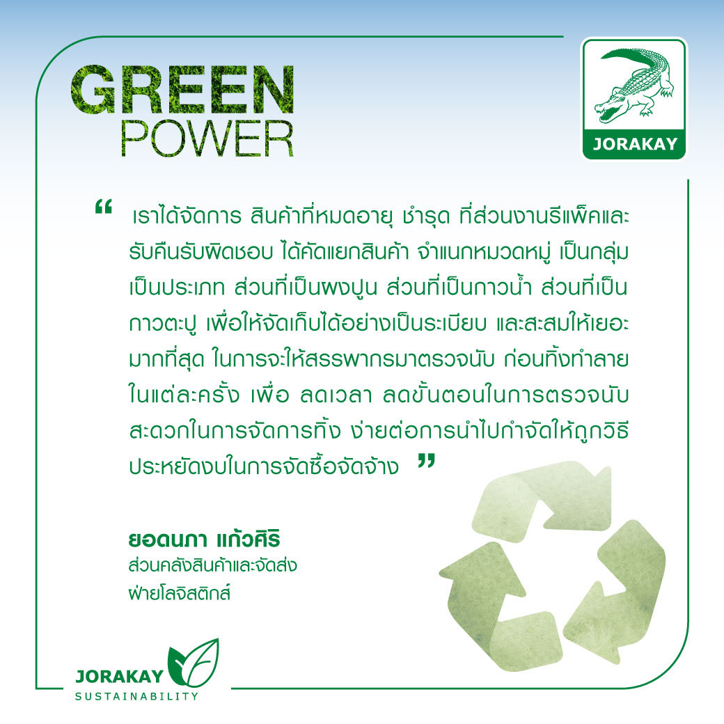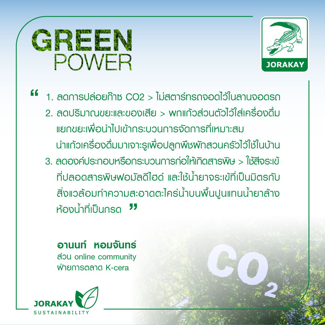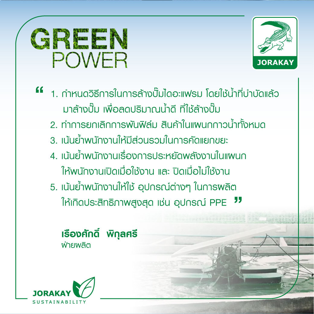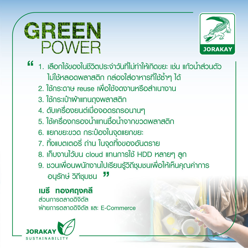 “จระเข้” ร่วมสร้างและส่งต่อ พลังสีเขียว Green Power ไอเดียรักษ์โลกในชีวิตประจำวันและการทำงานผ่านกิจกรรม “ครอบครัวจระเข้ ร่วมคิด ร่วมทำ สร้างสุข” เพื่อสนับสนุน 5 เป้าหมายด้านความยั่งยืนของ “จระเข้” (Jorakay Sustainability Goals) และสร้างสมดุล DNA ข้อที่ 6 “ดี เป็นคนดี” ร่วมกันก่อสร้างความสุขที่ยั่งยืนและสามารถส่งต่อให้กันและกันเพื่อคุณและครอบครัว “สู่ความยั่งยืนของโลก”