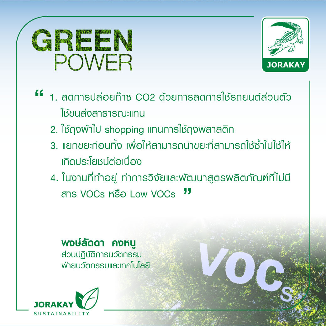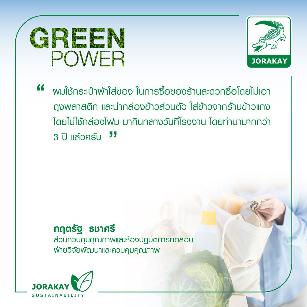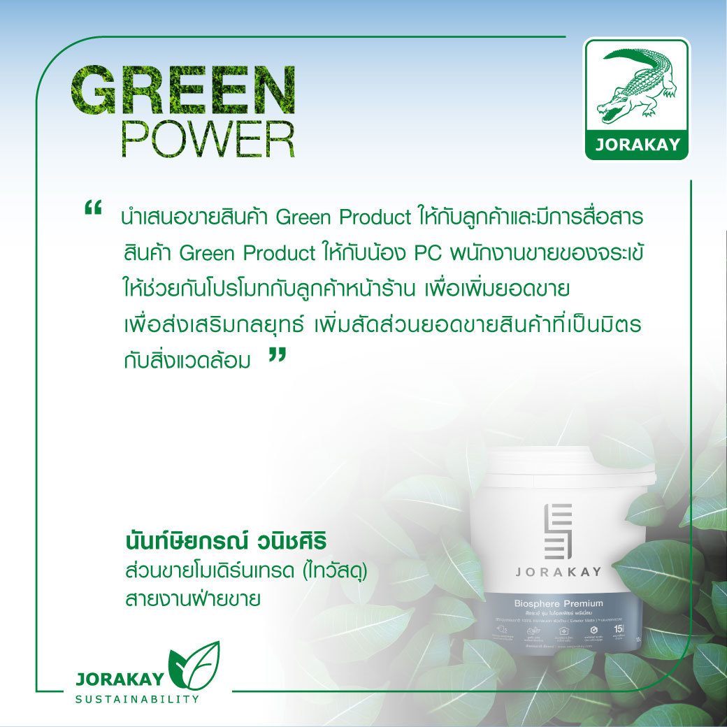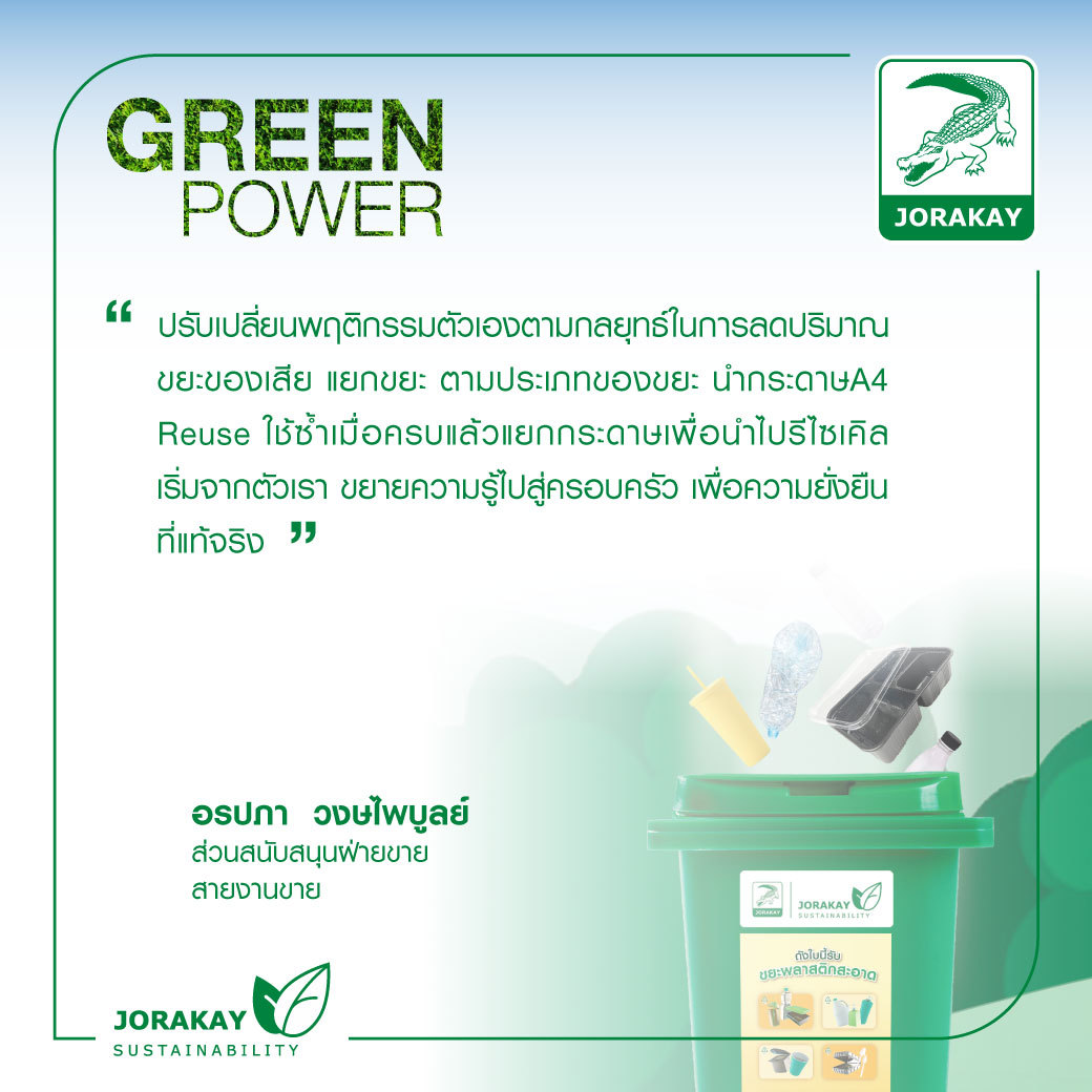 “จระเข้” ร่วมสร้างและส่งต่อ พลังสีเขียว Green Power ไอเดียรักษ์โลกในชีวิตประจำวันและการทำงานผ่านกิจกรรม “ครอบครัวจระเข้ ร่วมคิด ร่วมทำ สร้างสุข” เพื่อสนับสนุน 5 เป้าหมายด้านความยั่งยืนของ “จระเข้” (Jorakay Sustainability Goals) และสร้างสมดุล DNA ข้อที่ 6 “ดี เป็นคนดี” ร่วมกันก่อสร้างความสุขที่ยั่งยืนและสามารถส่งต่อให้กันและกันเพื่อคุณและครอบครัว “สู่ความยั่งยืนของโลก”