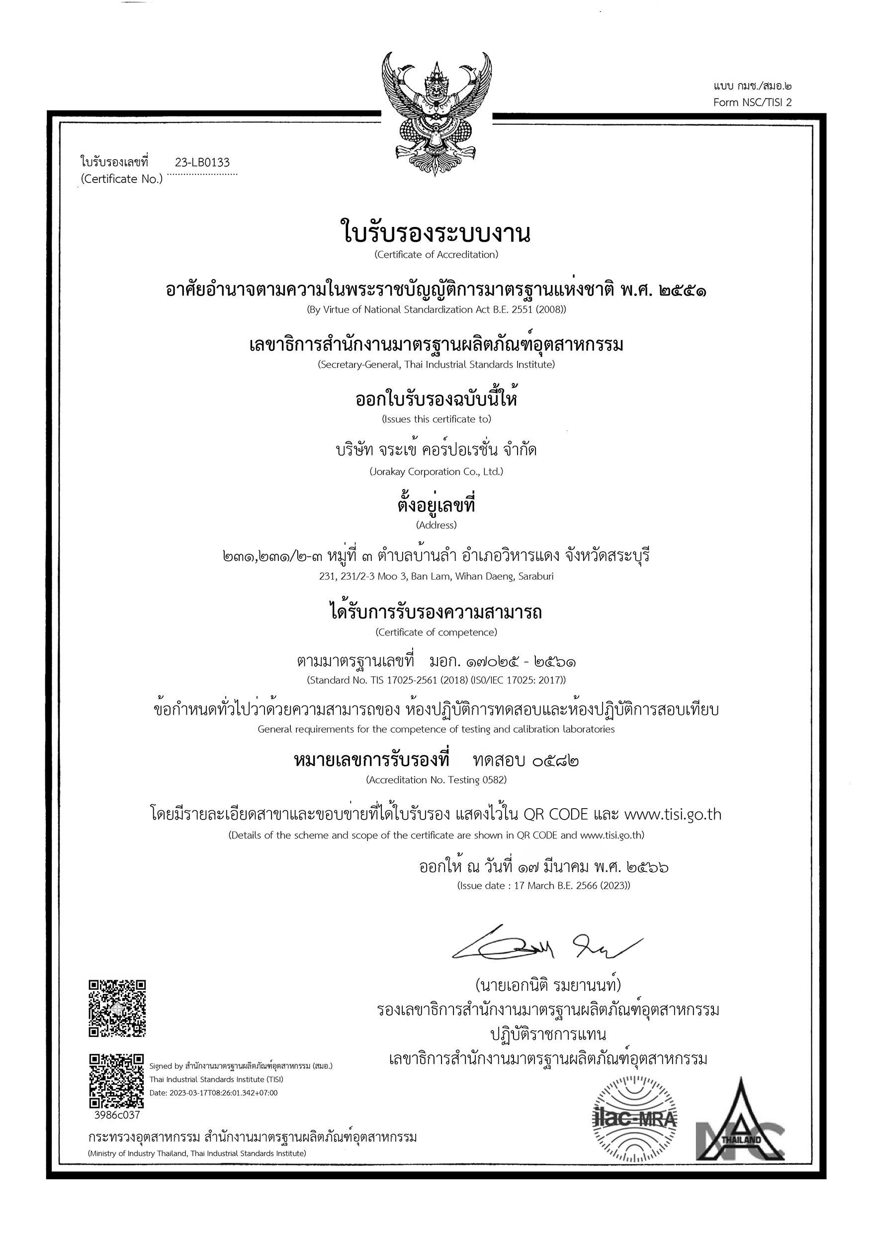 บริษัท จระเข้ คอร์ปอเรชั่น จำกัด ได้รับการรับรองความสามารถห้องปฏิบัติการทดสอบ หมายเลขการรับรองที่ ทดสอบ 0582 ตามมาตรฐาน มอก.17025-2561 (TIS 17025-2018) หรือ ISO/IEC 17025: 2017 ซึ่งเป็นห้องปฏิบัติการทดสอบเอกชนรายแรกในประเทศไทย ที่ได้รับการรับรอง ขอบข่ายการทดสอบสาขาโยธา ผลิตภัณฑ์กาวซีเมนต์ (Dry-set cement mortar) และผลิตภัณฑ์กาวซีเมนต์ (Ceramic tile - adhesives)